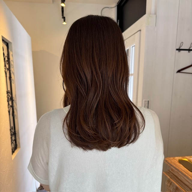 春の柔らかい薄オレンジの日差しがより暖色系ヘアカラーを引き立ててくれます。