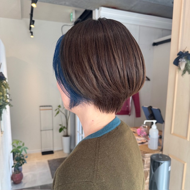根元と内側はブルーブラックに、表面の毛先をブリーチしてビリジアンカラーをon!